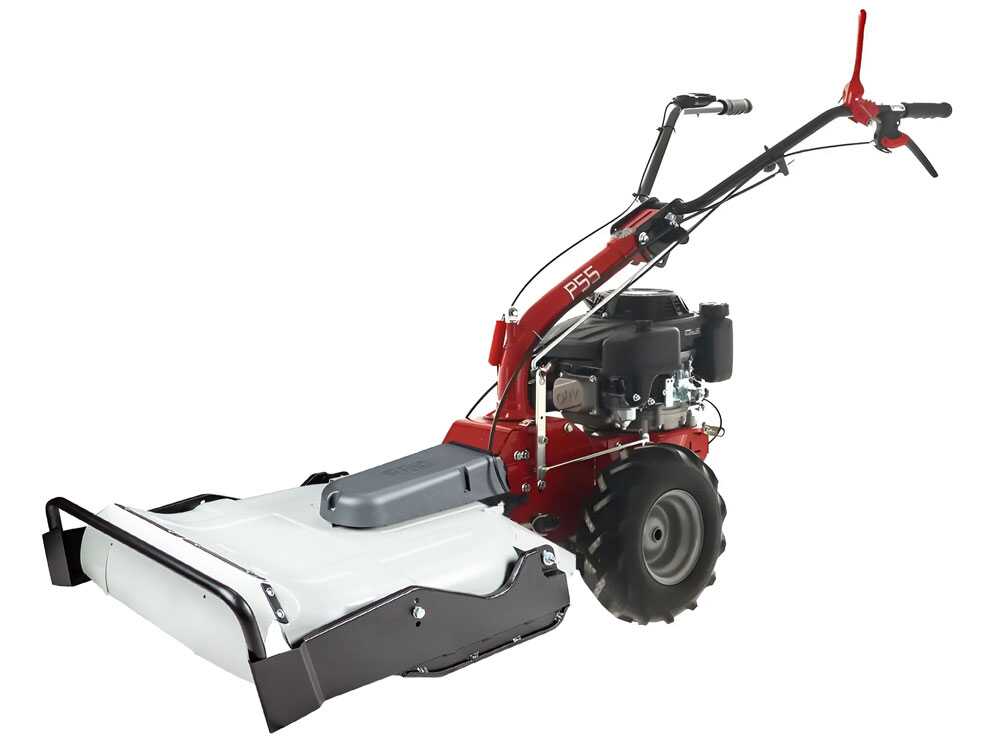 La tondeuse débroussailleuse thermique P 55 est une machine à moteur thermique autotractée, dotée de roues pneumatiques profilées tractées, et reliées à une transmission avec vis sans fin par bain d’huile.